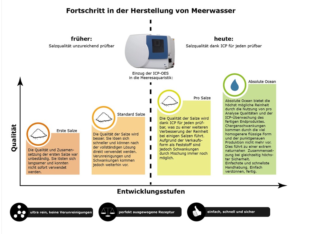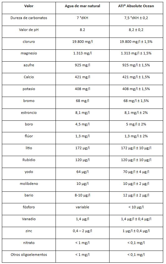 Igual que el agua de mar natural : Mediante mediciones de laboratorio de alta precisión con ICP, todos los elementos principales y trazas se ajustan con tanta precisión que Absolute Ocean es prácticamente idéntico al agua de mar natural. Incluso las concentraciones más bajas de elementos traza, en el rango de millonésimas de gramo, como el vanadio, se ajustan a valores casi naturales. La siguiente tabla muestra una comparación de Absolute Ocean con agua de mar natural (a 35 PSU):