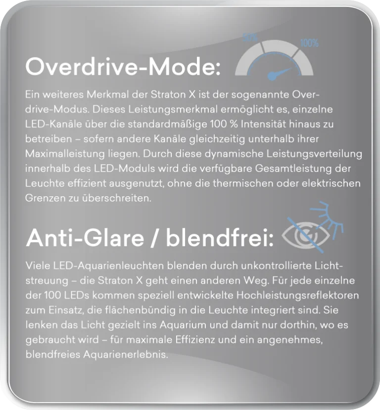 Resumen de rendimiento: Más luz. Menos consumo. Máximo control. El Straton X produce hasta el doble de luz útil que muchos otros sistemas LED con el mismo consumo. Esto se traduce en un menor consumo de energía, menores costes operativos y una impresionante potencia lumínica. Esto ahorra energía, protege el medio ambiente y su bolsillo, y permite que sus corales crezcan visiblemente.